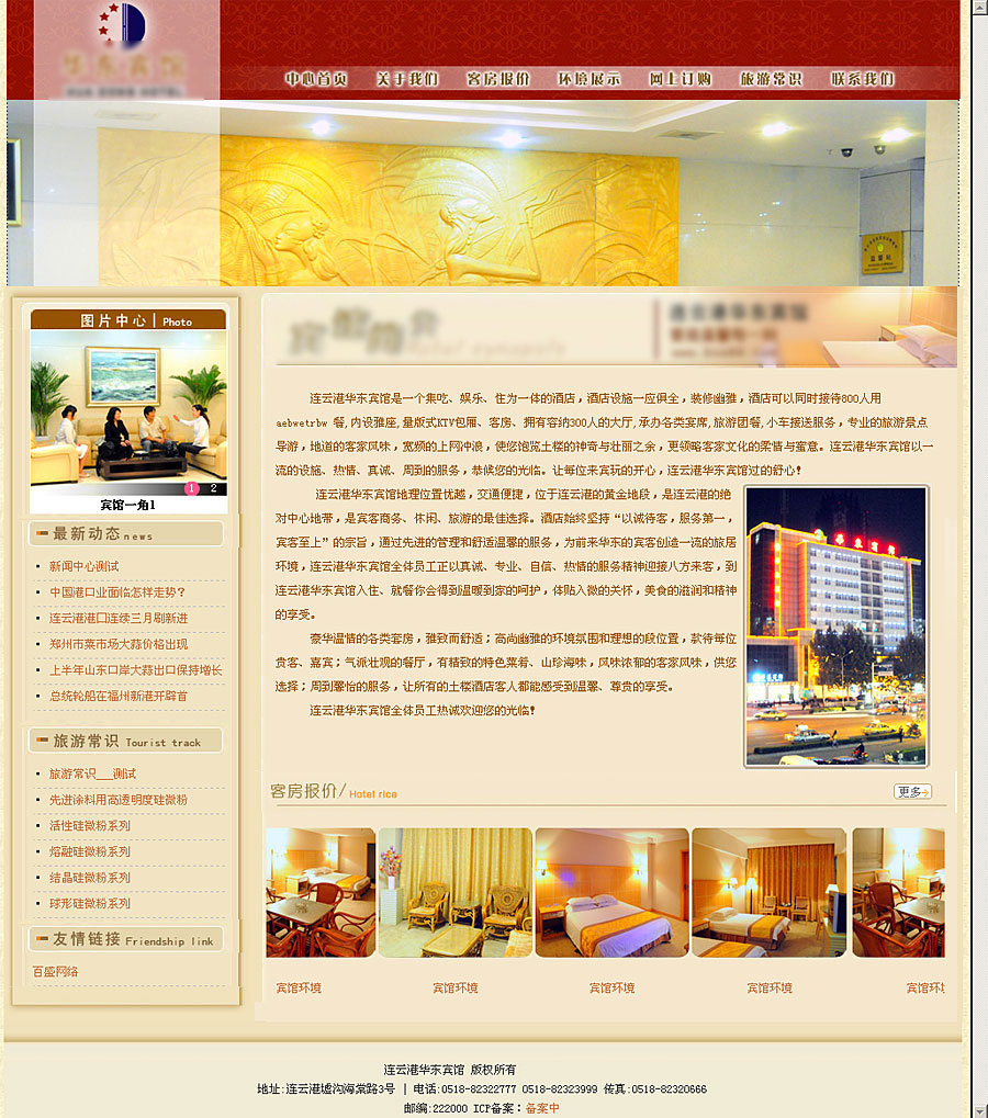 華東賓館整站制作,整個頁面整用暖色調設計__網站后臺采用了自己開發的文章管理系統.