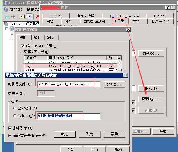 4、在需要開通視頻拖放功能的主機上右鍵-屬性-主目錄-配置-添加擴展名為“.mp4”,可執(zhí)行文件為mod_h264_streaming.dll,動作限制為:GET,HEAD,POST,DEBUG。