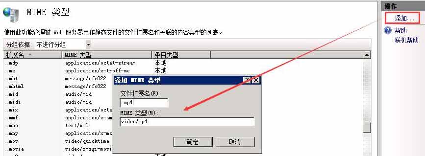 3、打開“Internet 信息服務(wù)(IIS)管理器”,點擊計算機名,切換到功能視圖,選擇“MIME類型”->添加 文件擴展名“.mp4”,MIMIE類型“video/mp4”。