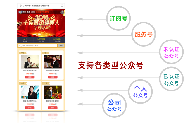 一個(gè)投票評(píng)選活動(dòng)可以有多個(gè)公眾號(hào)參與(可以讓個(gè)人公眾號(hào)、單位公眾號(hào)、訂閱號(hào)、服務(wù)號(hào)、未認(rèn)證公眾號(hào)都可以同時(shí)進(jìn)行一個(gè)活動(dòng))