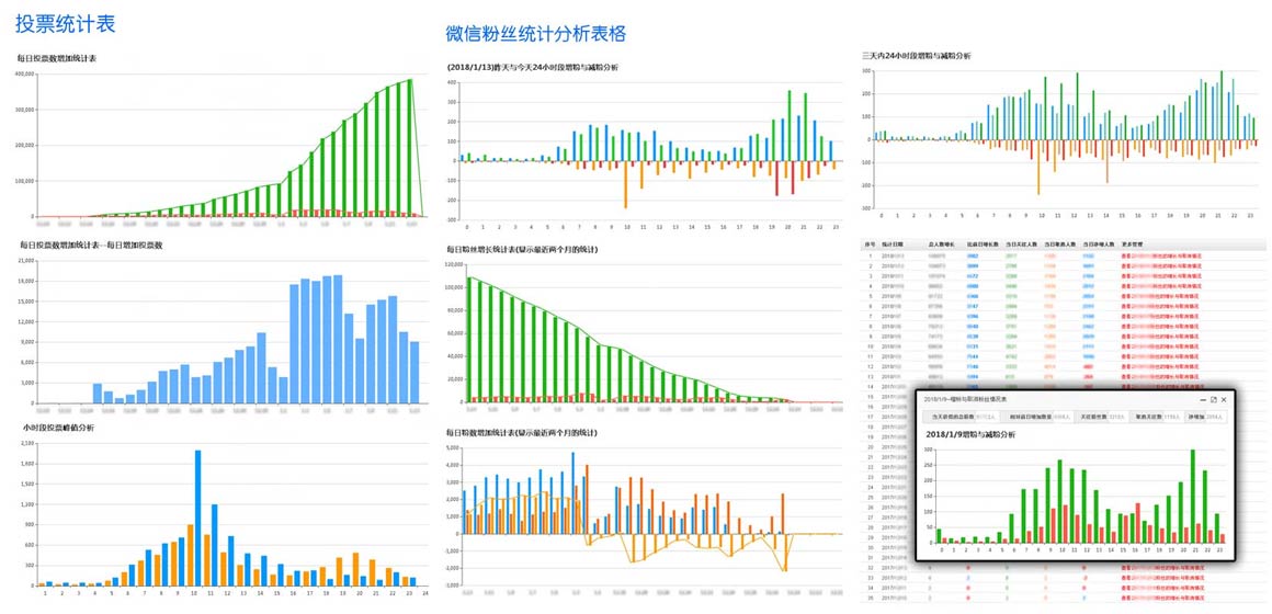 每天都有詳細(xì)的漲粉統(tǒng)計(jì)、投票統(tǒng)計(jì),詳細(xì)到24小時(shí)統(tǒng)計(jì)與分析,讓你隨時(shí)了解現(xiàn)在活動(dòng)的發(fā)展以便于隨時(shí)調(diào)整活動(dòng)玩法